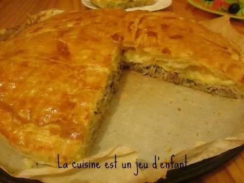 Sur une plaque allant au four , dérouler la pâte feuilletée puis disposer au milieu la préparation.