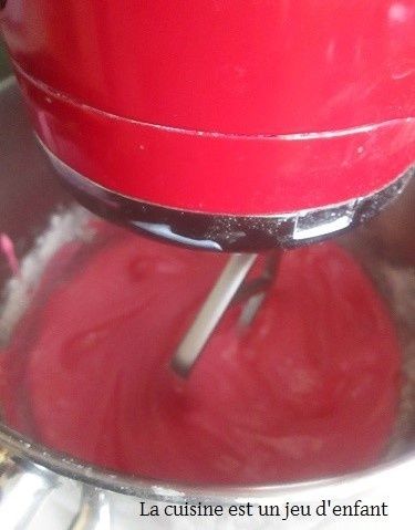 Une fois le sirop versez , laissez tournez le robot jusqu'à ce que la meringue est refroidie, votre meringue doit être brillante, ferme et elle doit former un "bec d'oiseau"