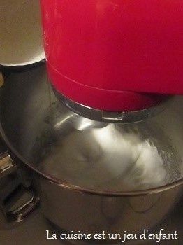 Quand le sirop a atteint la bonne température que que les blancs sont bien montés en neige, versez doucement le sirop le long de la cuve pendant que le robot tourne a pleine vitesse.